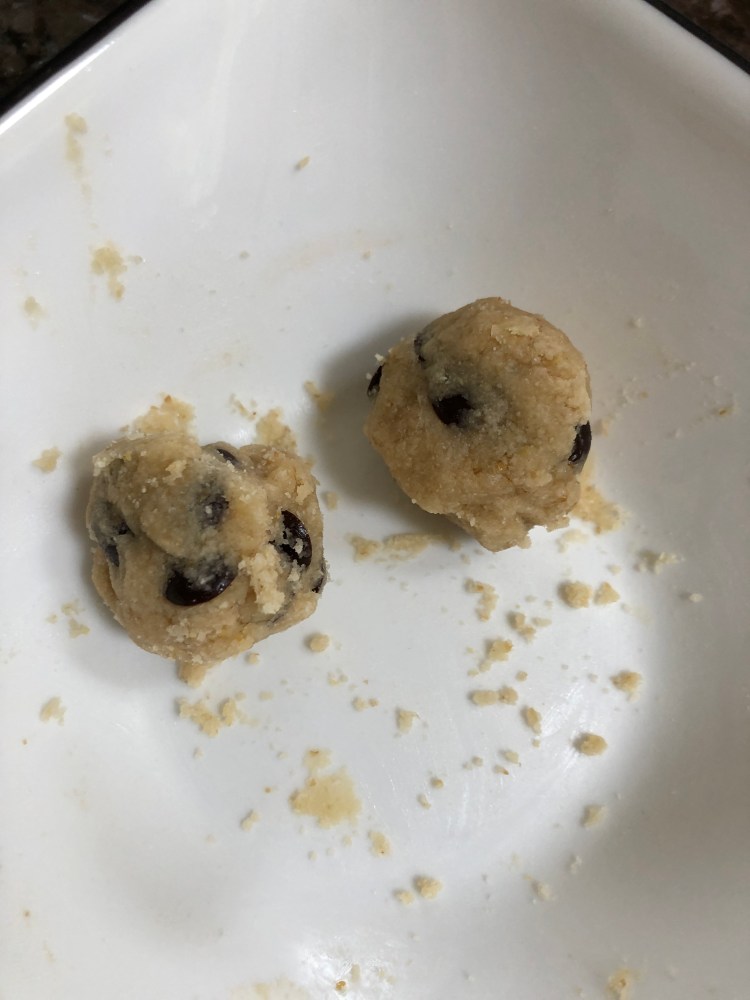 Cream together the butter, sweetener molasses, salt and vanilla. Then mix in the baking blend (or two flour substitutes) and the chocolate chips. Form into 2 cookie dough bites!