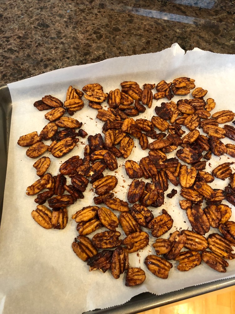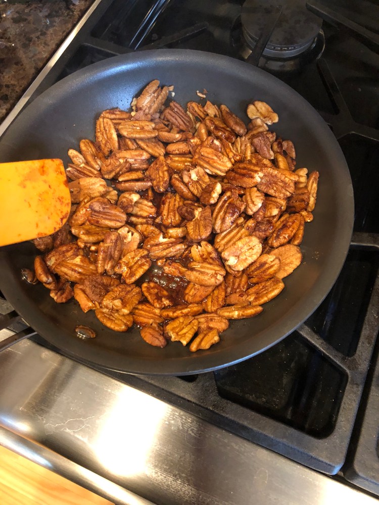 Melt the butter in a skillet, and add all the other ingredients. Constantly stir the mixture so it doesn’t burn. When all the pecans are coated evenly, transfer to a cookie sheet lined in parchment paper.
