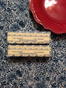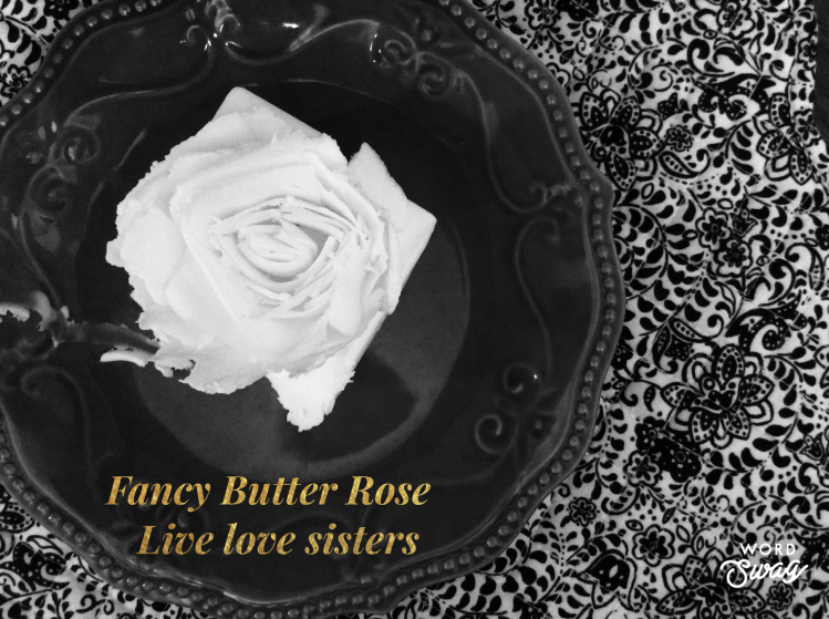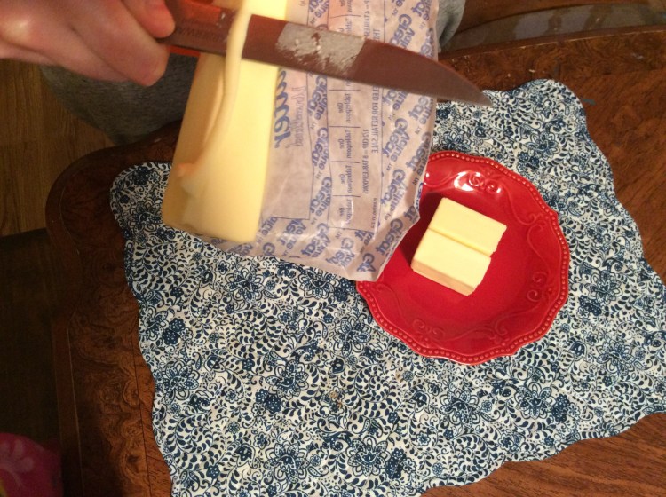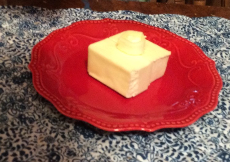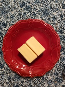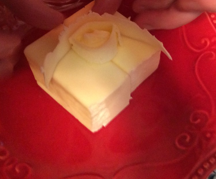 Cut the first stick of butter in half, in wrap and place on the platter , this becomes your base for the rose.