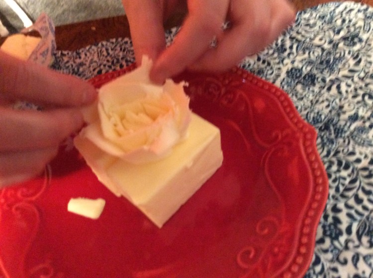 Shape into a small circle, this becomes the middle of your rose. Continue to peel the butter and shape around working from the inside out. These become your petals. Alternate which sides you places the petals on.