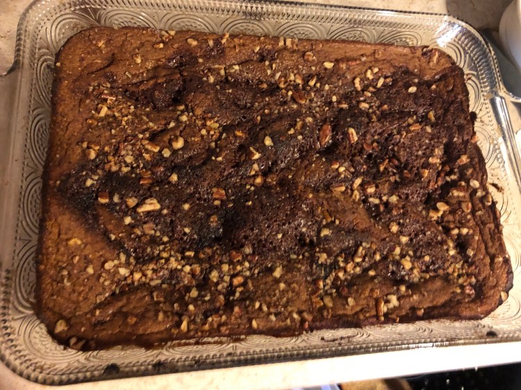 * I thought of making a Cream cheese glaze to add some color. But this cake is so sweet and gooey on its own the frosting really isn’t needed.