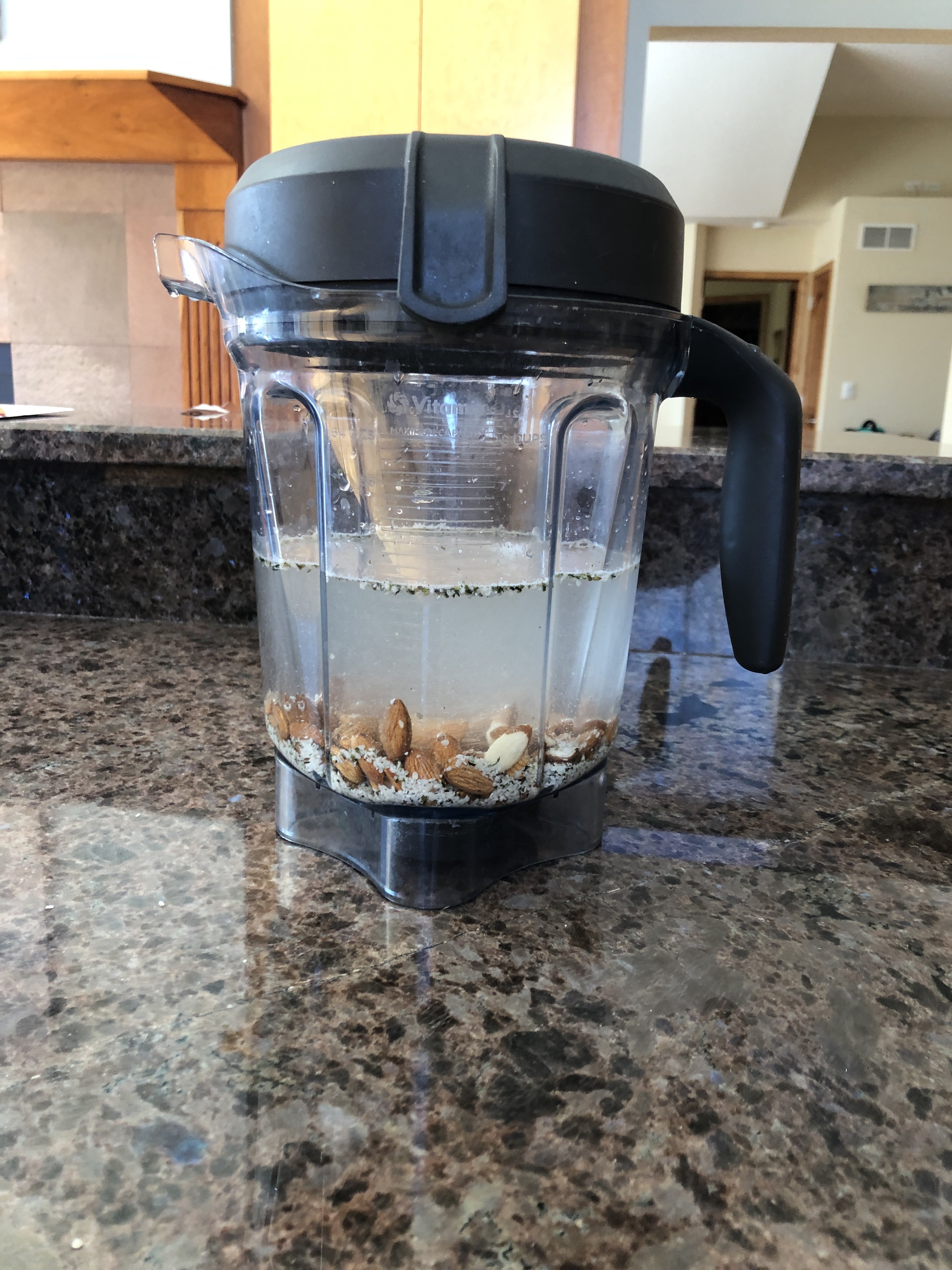 Soak 1 cup of almonds and 1/4 cup of hemp hearts in your blender with water for 4-6 hours.