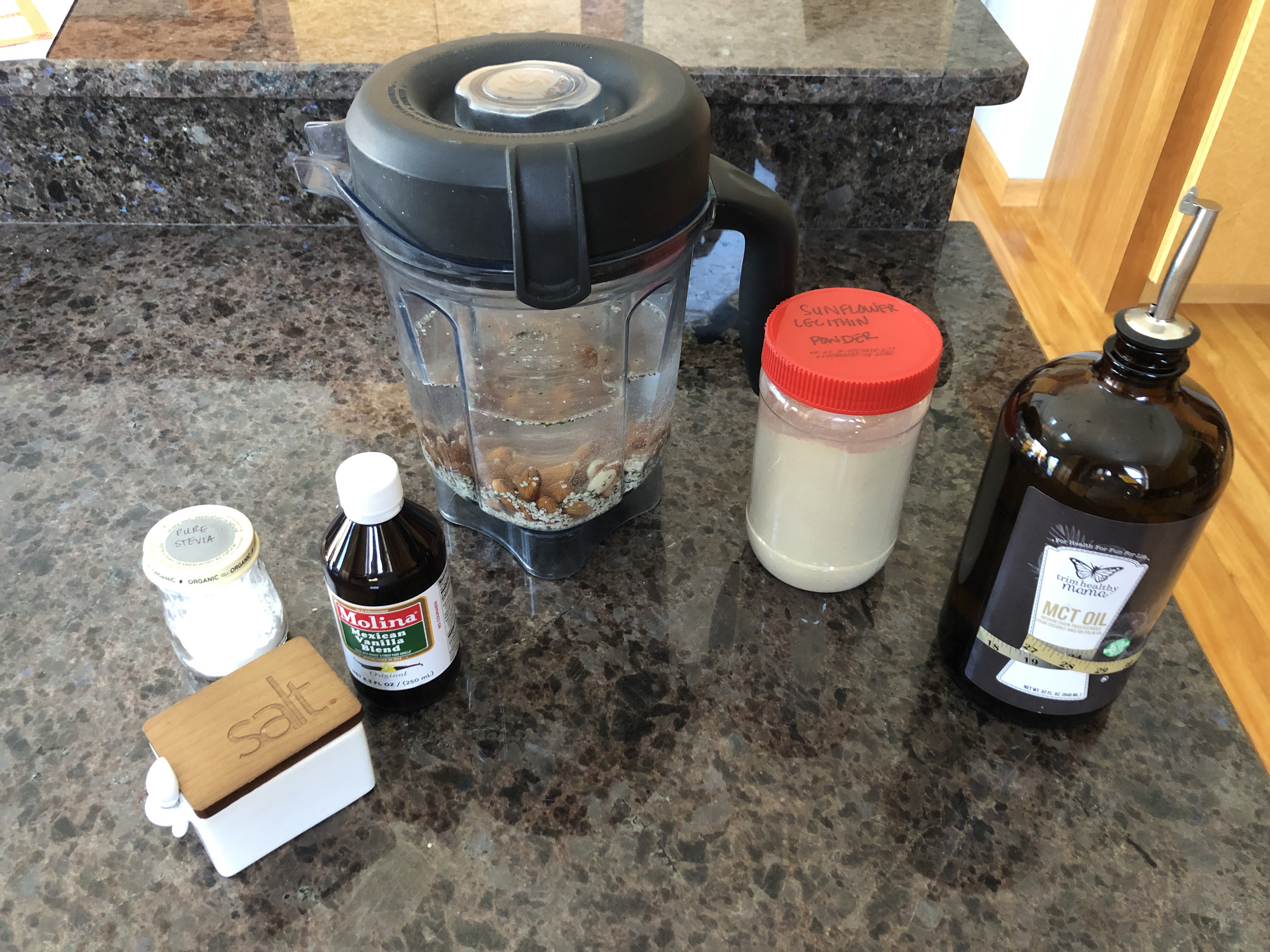 Once the almonds and hemp hearts have soaked, strain them, and return to the blender with 4 fresh cups water and add in 1/4 teaspoon of sunflower lecithin, a pinch of salt and 1 teaspoon MCT oil. for vanilla flavored almond milk add 1 teaspoon vanilla and 1 doonk (1/32 tsp) pure stevia powder.