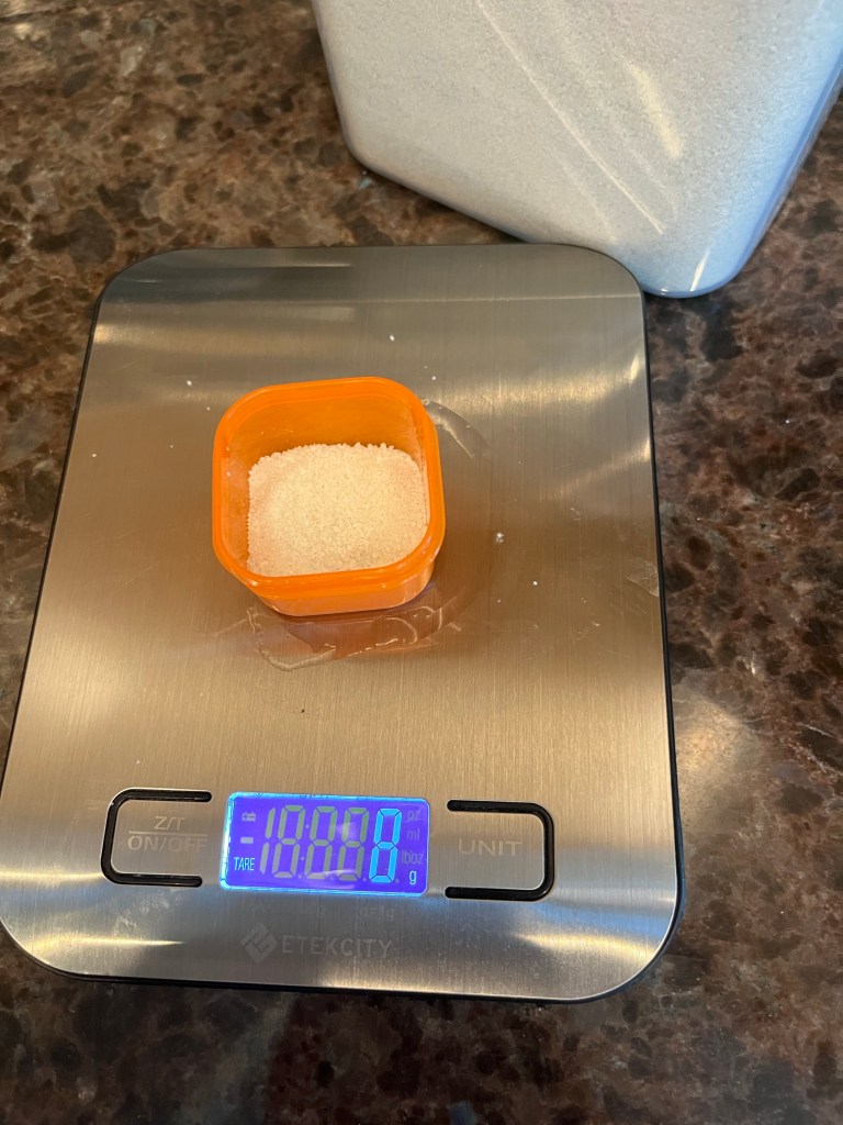 Remove the jar from the scale. We need to measure salt now- zero the scale with a small container.
