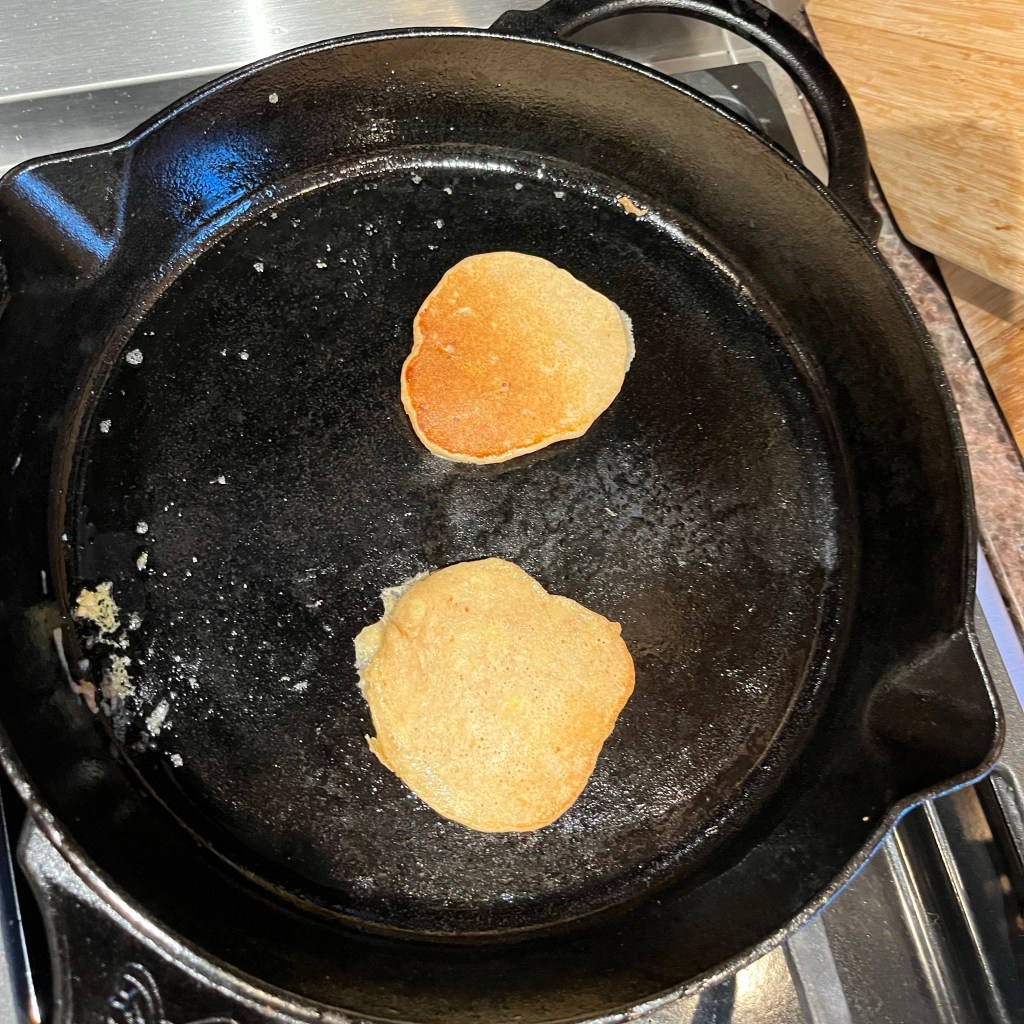 Cook this up like pancakes in a skillet over medium. This makes about 10 small pancakes- which is perfect for my 3 littles. You could easily double for more kiddos or for yourself! My kids like them plain, the sweetness of the banana is enough for them! Peanut butter would be so tasty on top!
