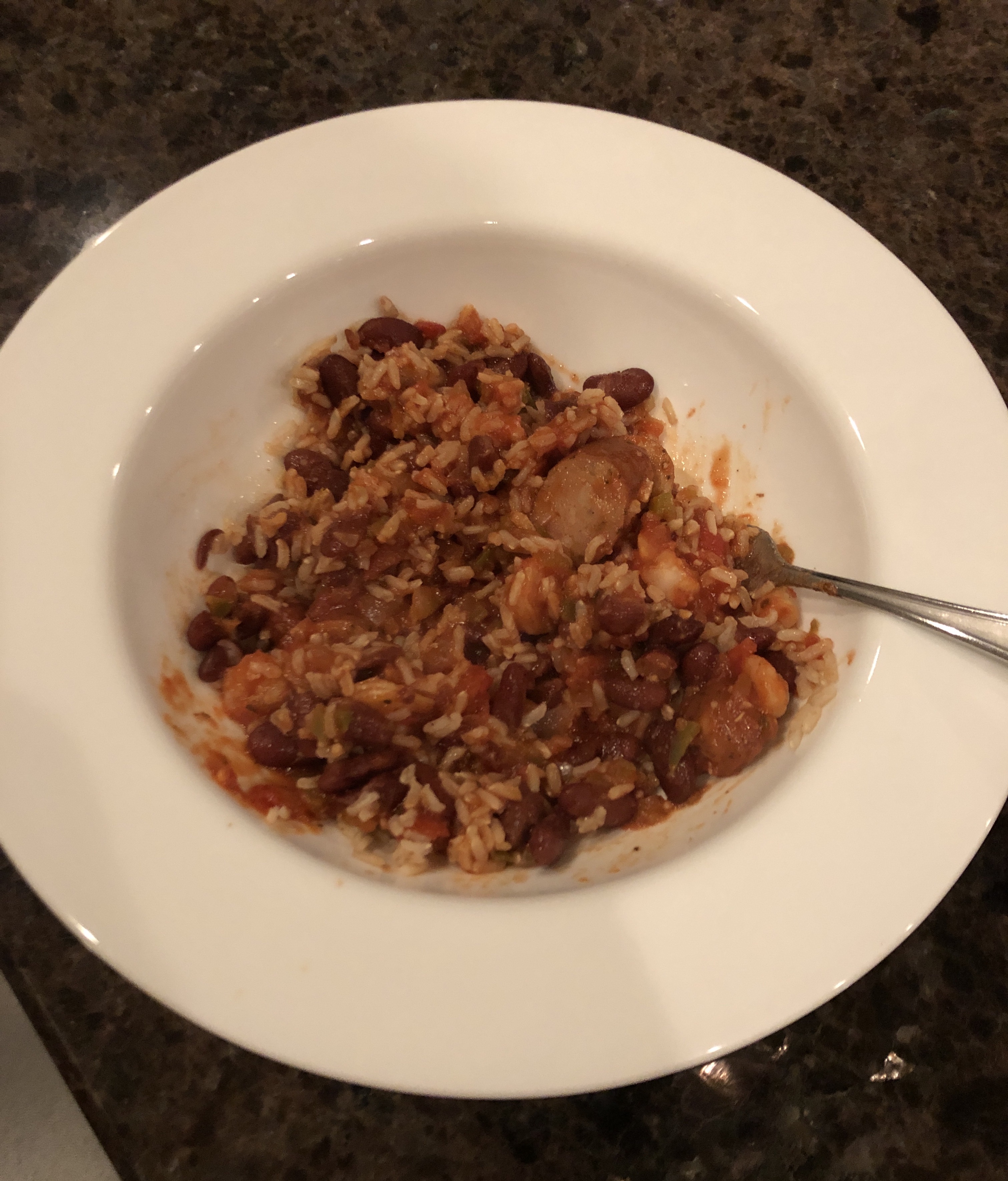 Serve the tomato, shrimp/sausage mixture on top of beans and rice! Enjoy!
